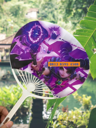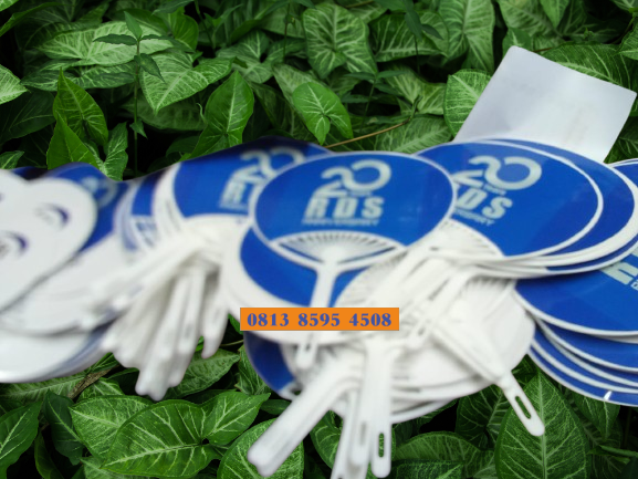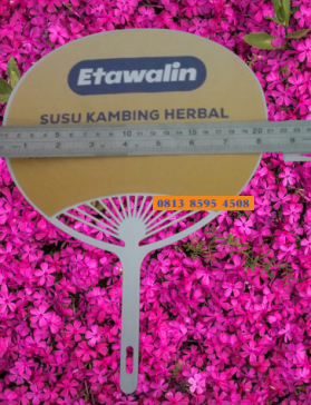 Ini salah satu contoh produk kami kipas gagang plastik model kerang desain bisa sesuai desain pemesan di cetak di bahan stiker kemudian di pasang rangka kipas